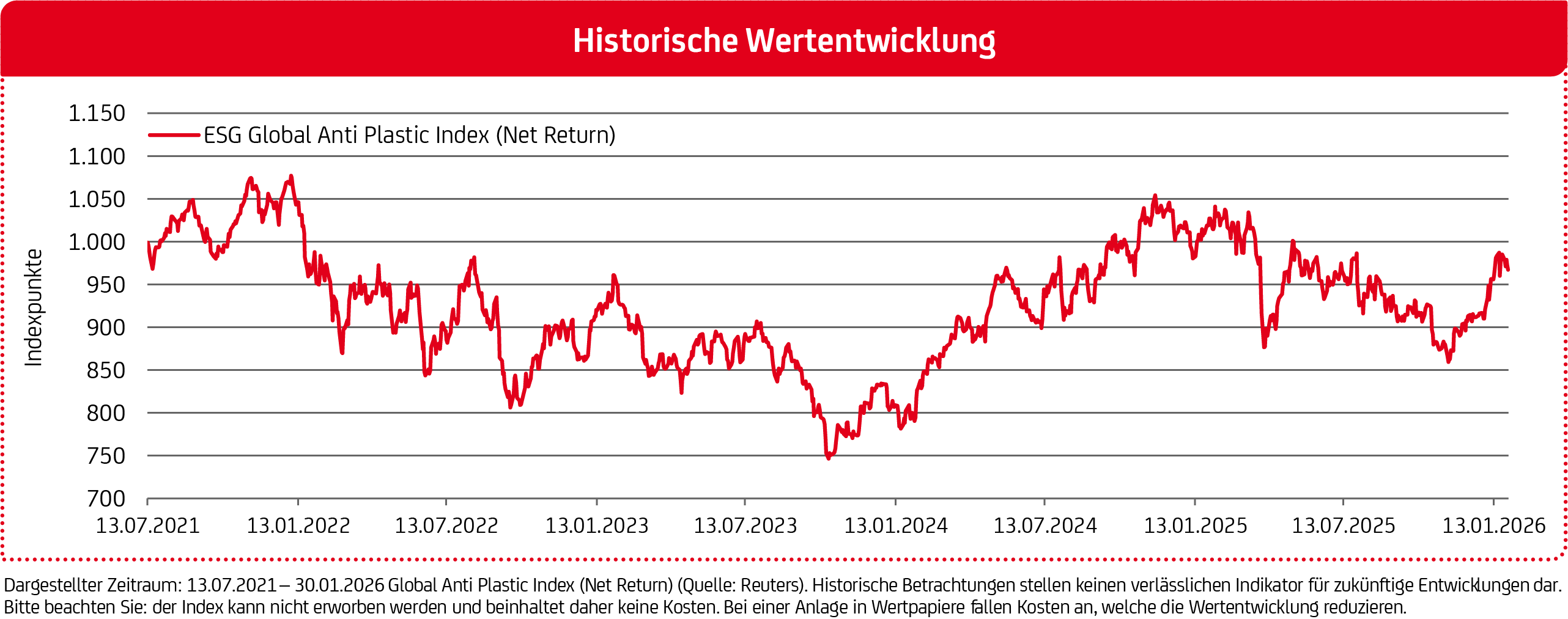 Der Global Anti Plastic Index (Net Return) bildet die Kursentwicklung von bis zu 25 Unternehmen ab, welche in den Bereichen Plastikvermeidung, -wiederverwendung und -recycling tätig sind.