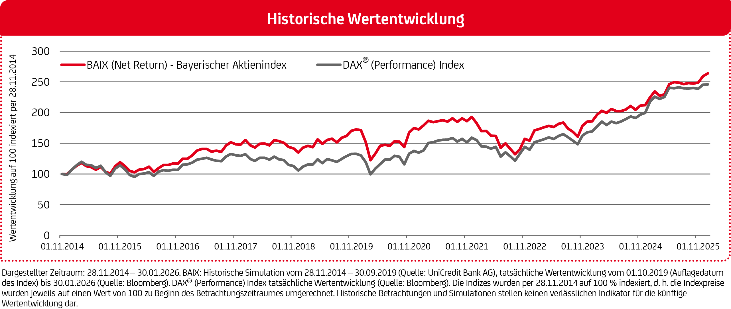 Der BAIX Strategy – Bayerischer Aktienindex (BAIX Strategy) besteht aus zwei Komponenten: dem Aktienindex BAIX und einem Geldmarktindex. Die Aufteilung zwischen den beiden Komponenten erfolgt dynamisch anhand eines flexiblen Sicherungssystems. Details siehe Kundenbroschüren.