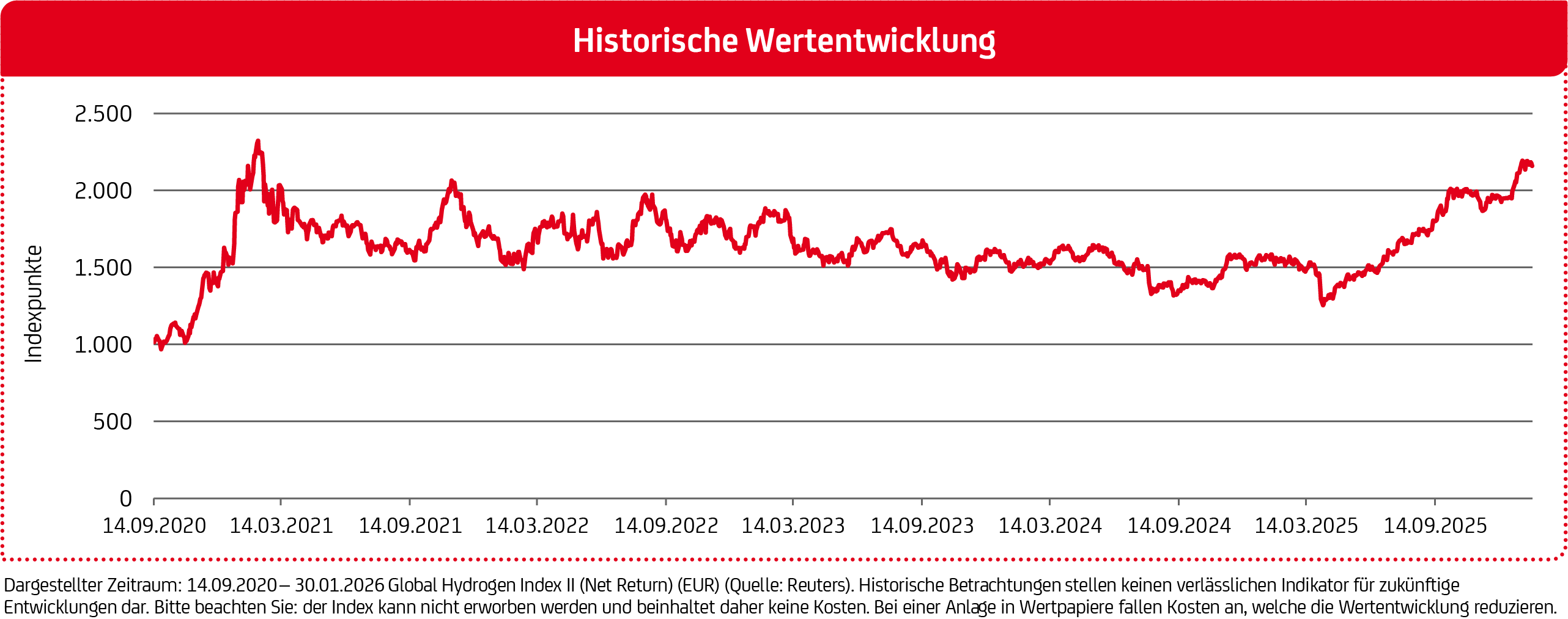 Der Global Hydrogen Index (Net Return) bildet die Kursentwicklung von bis zu 25 Unternehmen ab, welche in der Entwicklung und Produktion von Wasserstoff, Wasserstoffantrieben und Brennstoffzellen tätig sind.