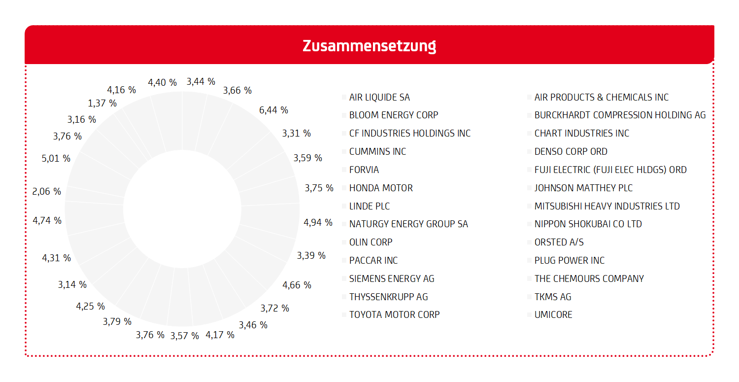 - Aktuell enthält der Index 25 Unternehmen. Dazu zählen derzeit beispielsweise Ballard Power Systems Inc., Linde plc., NEL ASA und Olin Corp.